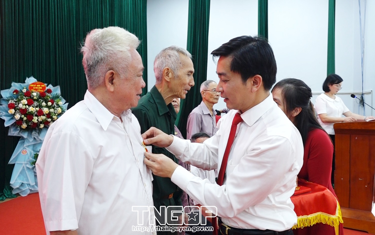 Đồng chí Đoàn Quang Duy, Bí thư Đảng ủy xã Phú Lương trao Huy hiệu Đảng cho các đảng viên