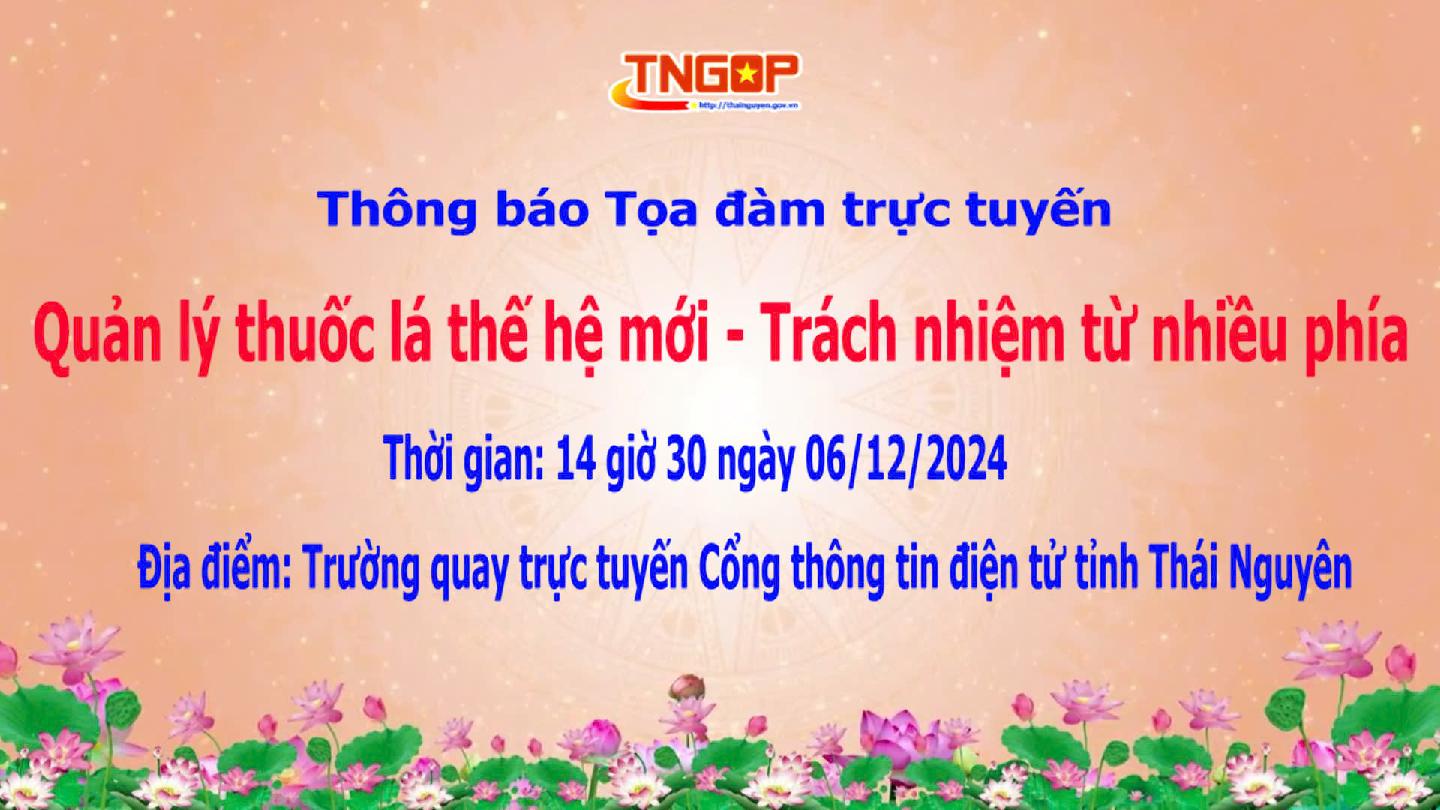 Vào lúc 14 giờ 30 phút ngày 6/12, Trung tâm Thông tin tỉnh Thái Nguyên tổ chức Chương trình Tọa đàm trực tuyến trên Cổng Thông tin điện tử tỉnh với chủ đề: Quản lý thuốc lá thế hệ mới - Trách nhiệm từ nhiều phía.