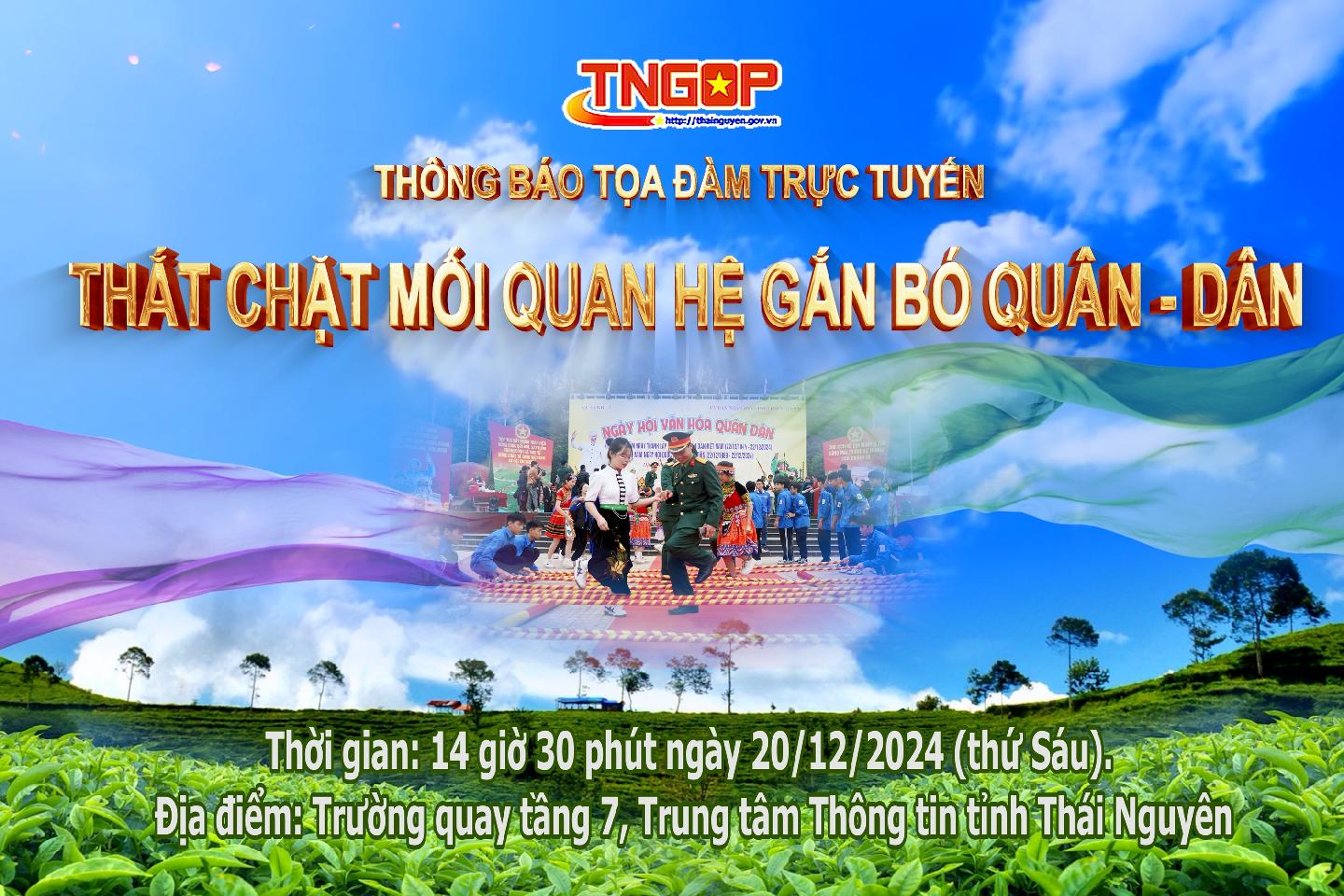 Vào lúc 14 giờ 30 phút ngày 20/12, Trung tâm Thông tin tỉnh Thái Nguyên tổ chức Chương trình Tọa đàm trực tuyến trên Cổng Thông tin điện tử tỉnh với chủ đề: Thắt chặt mối quan hệ gắn bó quân - dân