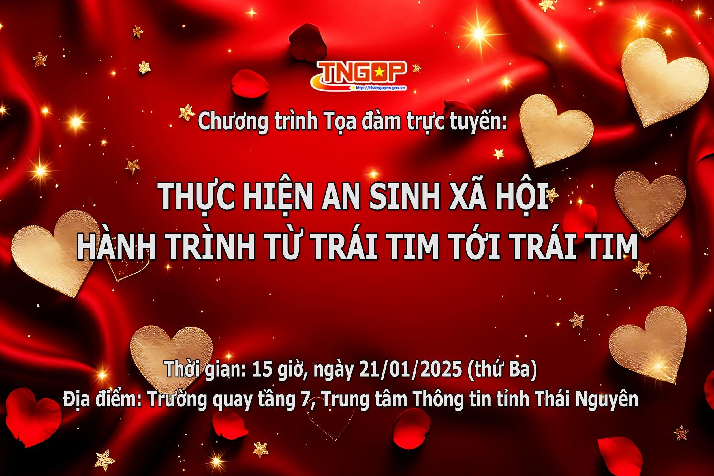 Vào lúc 15 giờ ngày 21/01, Trung tâm Thông tin tỉnh Thái Nguyên tổ chức Chương trình Tọa đàm trực tuyến trên Cổng Thông tin điện tử tỉnh với chủ đề: Thực hiện an sinh xã hội - hành trình từ trái tim tới trái tim.