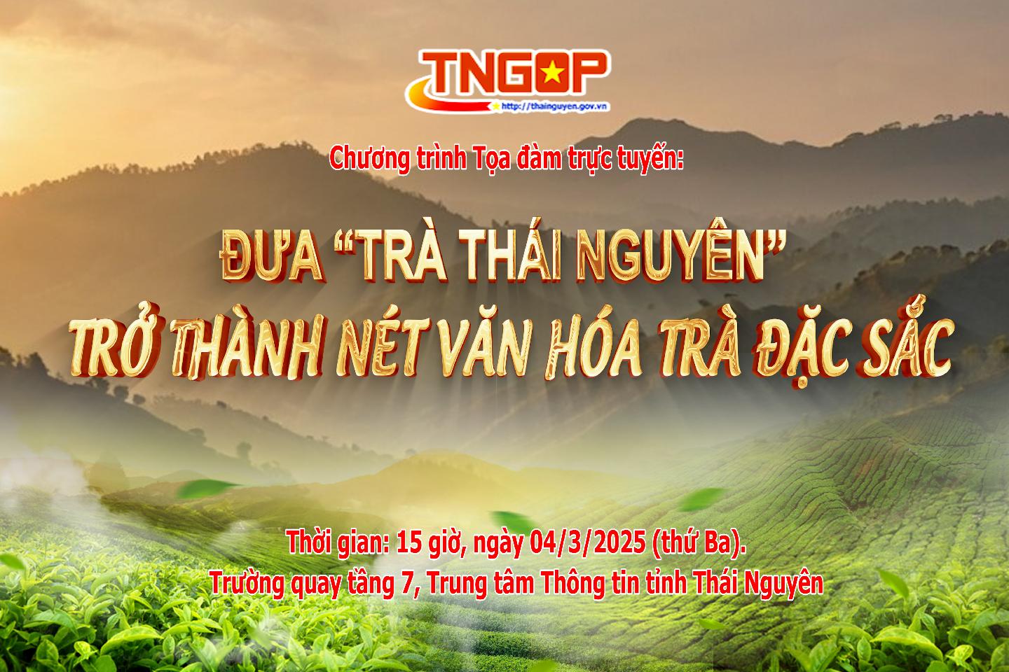 Nhằm bảo tồn, phát huy giá trị văn hóa, lịch sử góp phần nâng cao giá trị, thương hiệu chè Thái Nguyên theo hướng tích hợp đa giá trị từ trà, tỉnh Thái Nguyên đã tổ chức nhiều hoạt động ý nghĩa thiết thực nhằm định hình, phát triển văn hóa trà và gắn văn hóa trà với nhiều hoạt động kinh tế - xã hội, nhất là lĩnh vực du lịch. Để bàn luận sâu về nội dung này, Trung tâm Thông tin tỉnh Thái Nguyên tổ chức Chương trình Tọa đàm trực tuyến với chủ đề: Đưa “Trà Thái Nguyên” trở thành nét văn hóa trà đặc sắc.