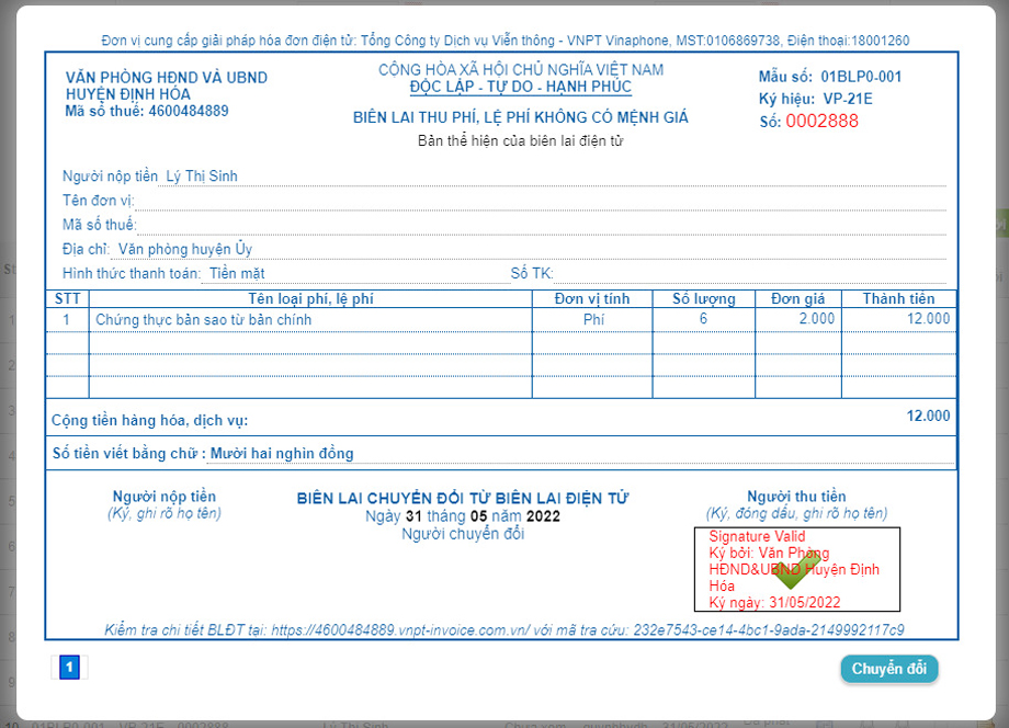 Tìm hiểu thêm chúng tôi được biết, việc sử dụng biên lai điện tử để thực hiện thu phí, lệ phí trong giải quyết TTHC tại Bộ phận tiếp nhận và trả kết TTHC do UBND huyện Định Hóa phối hợp với Trung tâm Kinh doanh VNPT Thái Nguyên triển khai theo hướng dẫn của Bộ Tài chính về việc in, phát hành, quản lý và sử dụng các loại chứng từ thu tiền phí, lệ phí thuộc ngân sách Nhà nước.