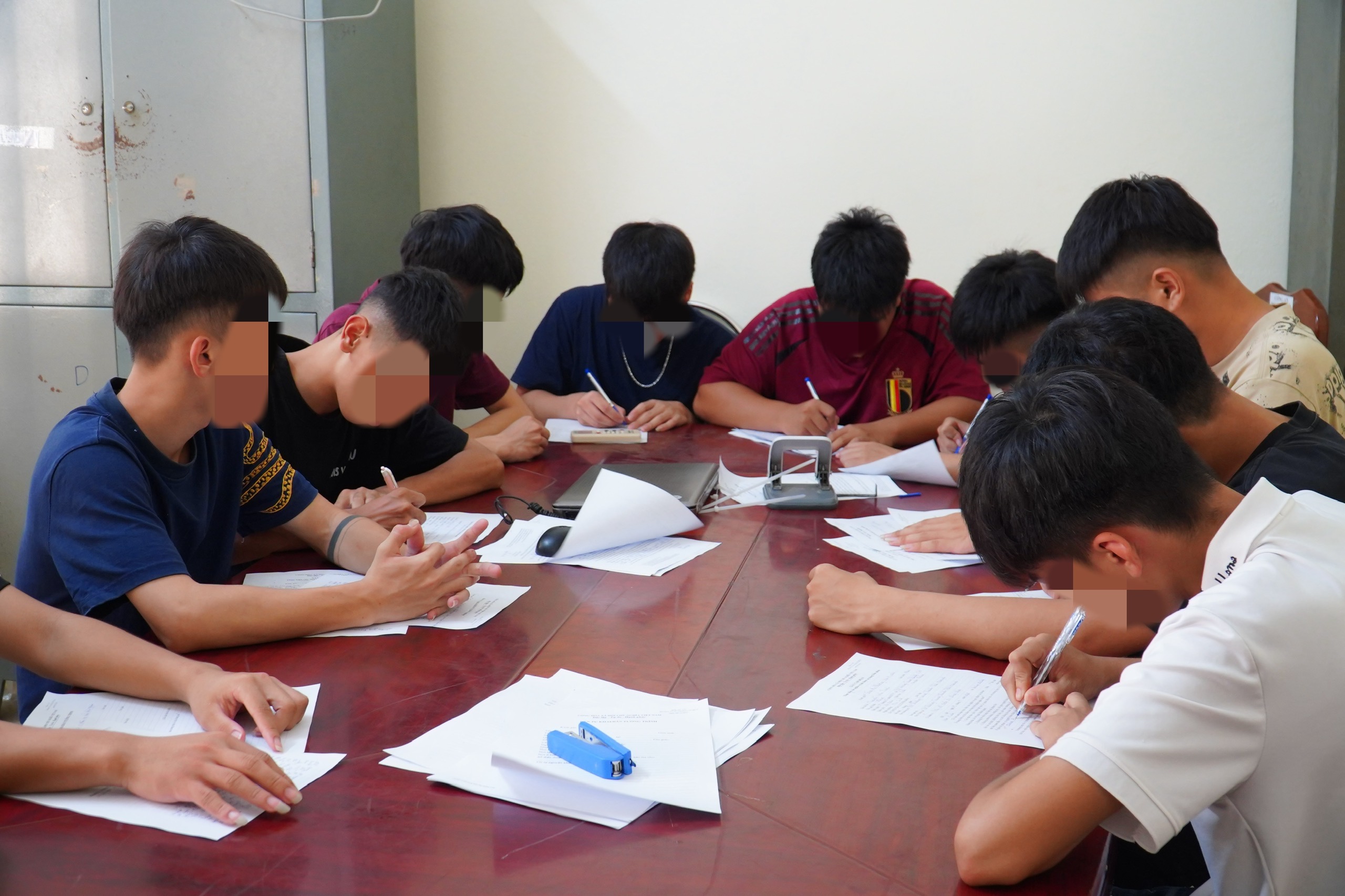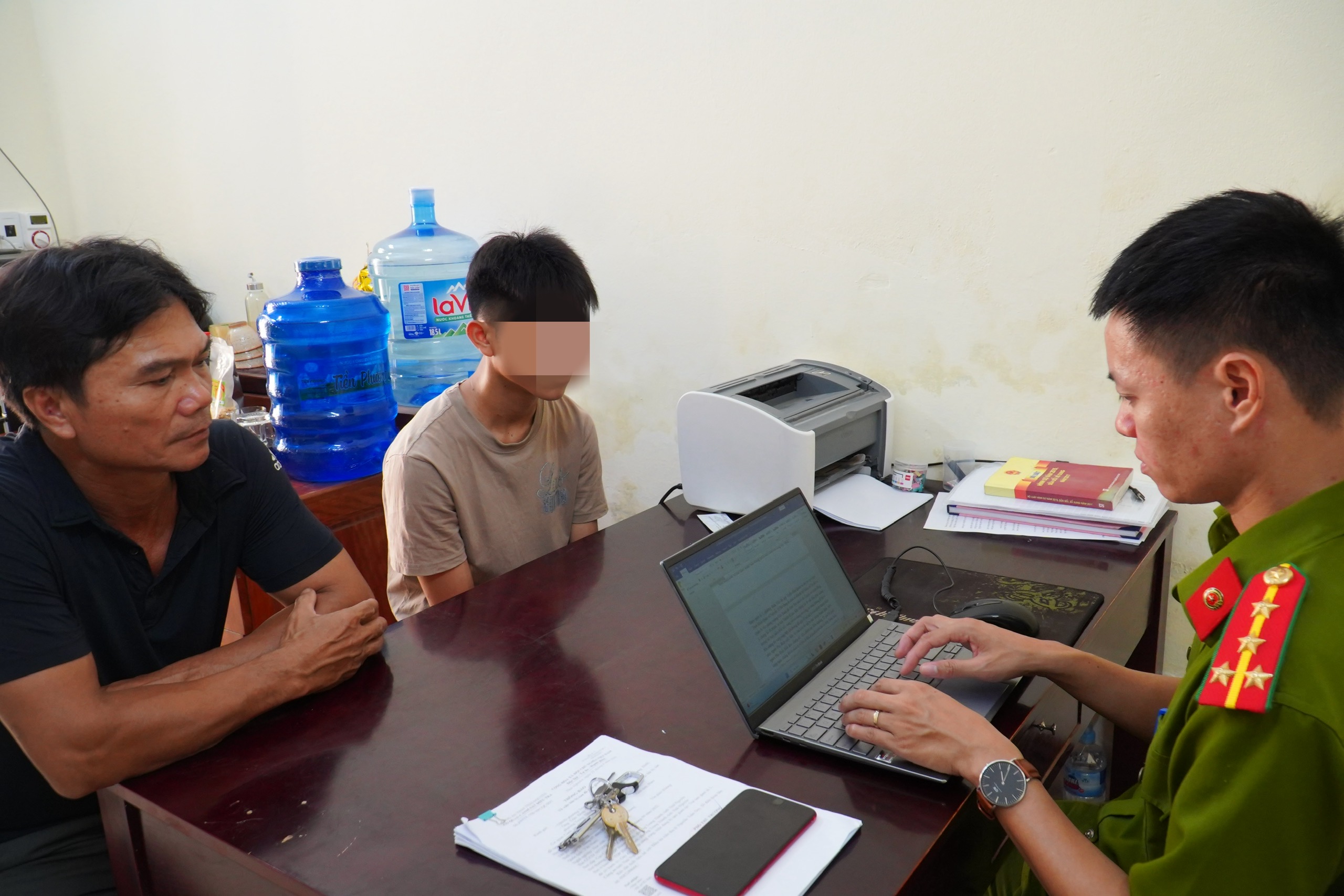 Công an phường Vạn Xuân lấy lời khai của đối tượng Trần Quốc Phong (sinh năm 2008, trú tại tổ dân phố Hương Đình, phường Trung Thành, tỉnh Thái Nguyên)