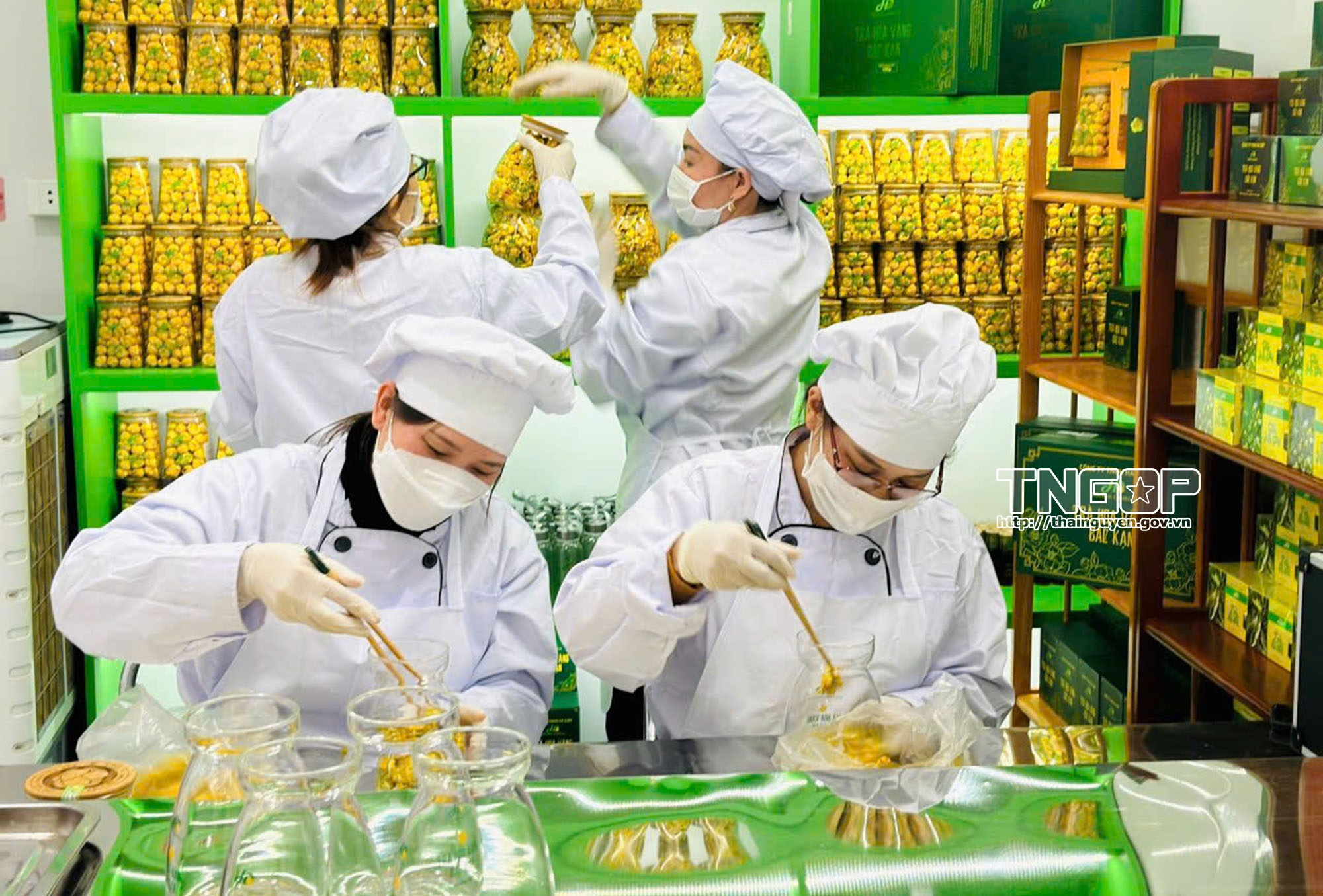 Quy trình đóng gói sản phẩm chè hoa vàng nguyên của Công ty TNHH Hà Diệp, phường Đức Xuân